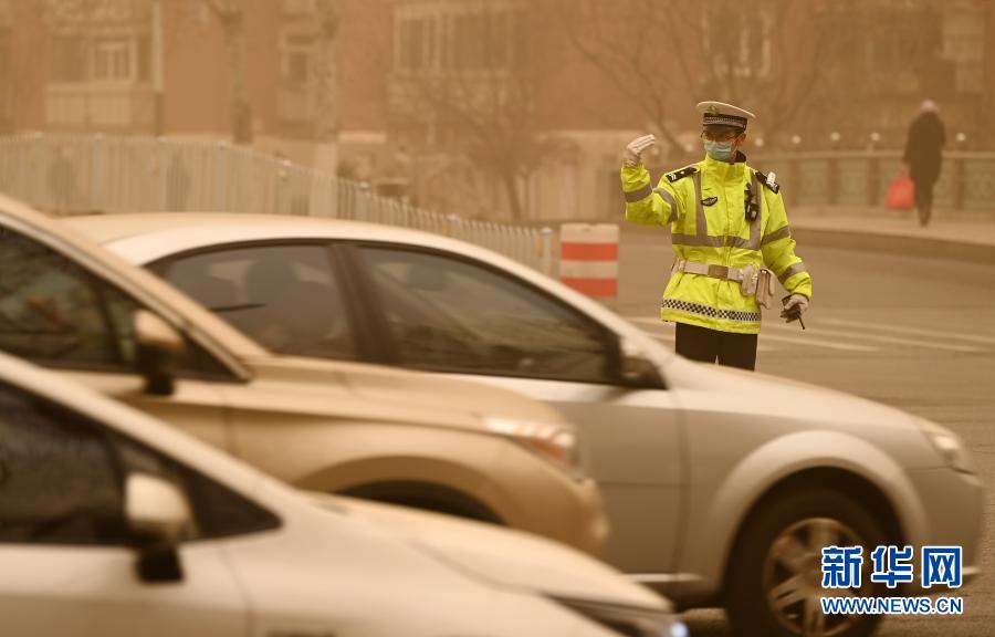 3月15日,交警在天津市南開區(qū)道路上執(zhí)勤。當(dāng)日,我國(guó)北方多地出現(xiàn)沙塵天氣。新華社記者 李然 攝