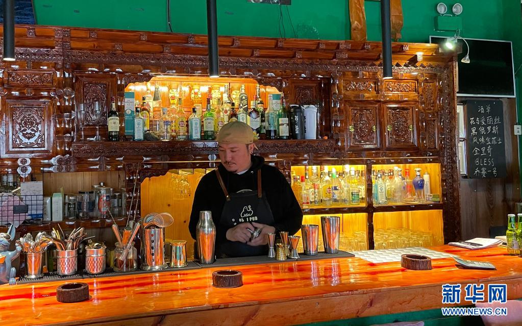 才仁俄賽在餐廳調(diào)酒(4月12日攝,手機(jī)照片)。新華社記者 劉江 攝