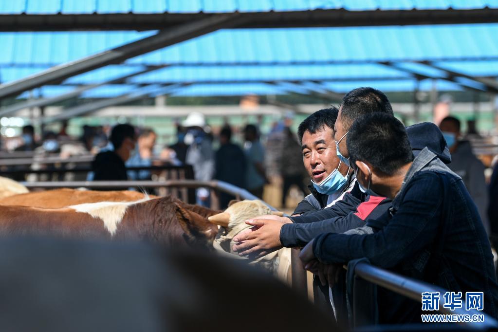 6月1日,交易者在開魯牛市交易攤位看牛詢價(jià)。