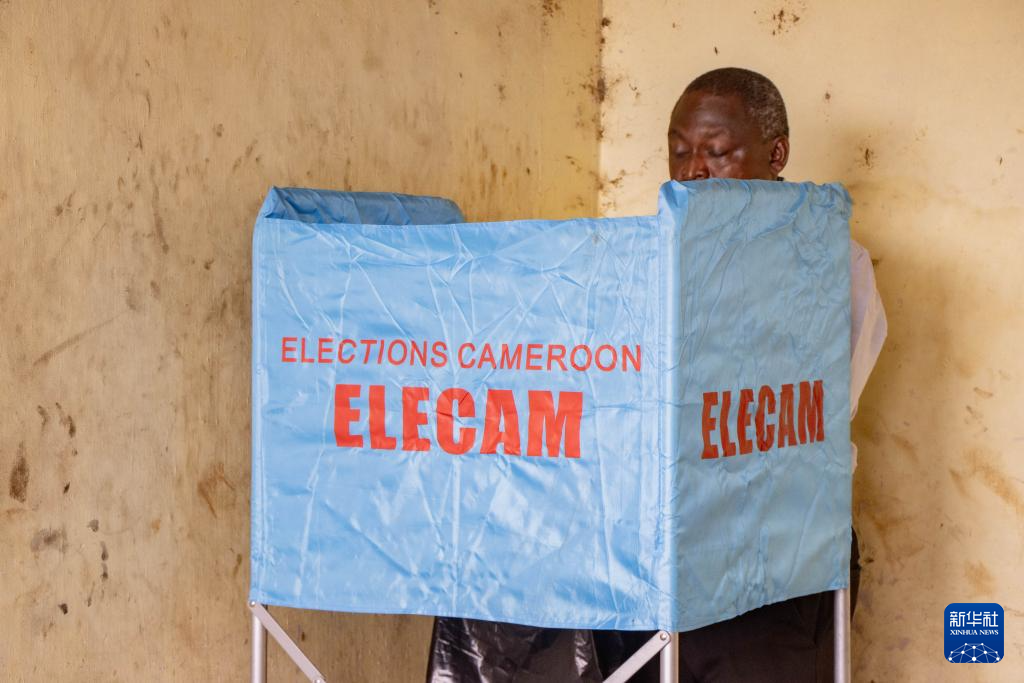 10月12日,在喀麦隆西南大区首府布埃亚,一名选民在投票间填写选票。新华社发(穆朗·廷古姆摄)