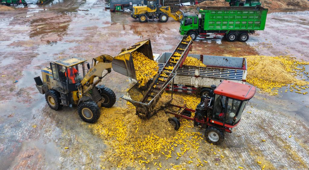 在山东省东营市广饶县一家粮食收储企业,工作人员在装运玉米进行脱粒(无人机照片)。(刘云杰 摄)