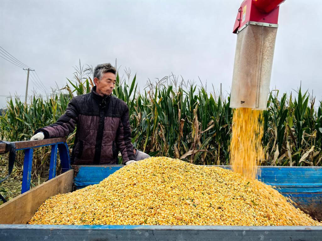 在菏泽市曹县苏集镇一处农田旁,收获的玉米正在装车。新华社记者叶婧 摄