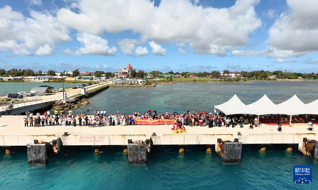 10月13日,执行“和谐使命-2025”任务的中国海军“丝路方舟”号医院船抵达汤加努库阿洛法港。这是欢迎仪式现场。新华社发(王俊川 摄)