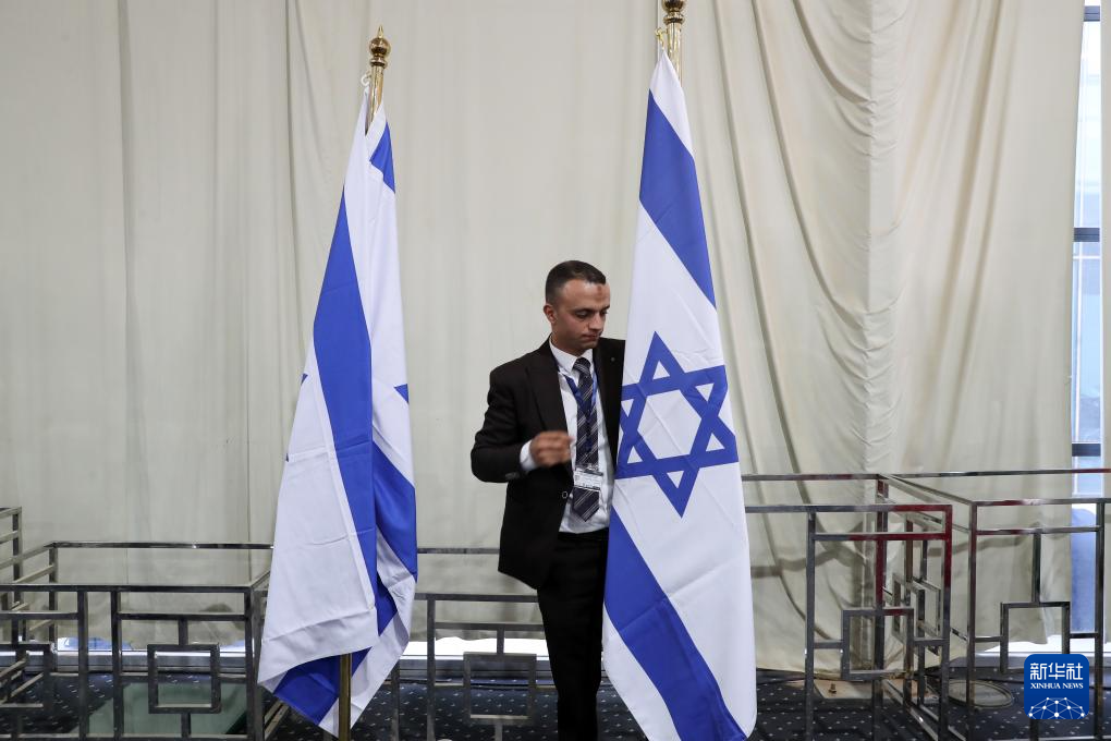 10月13日,在埃及沙姆沙伊赫,一名工作人员在沙姆沙伊赫峰会的媒体中心整理以色列国旗。