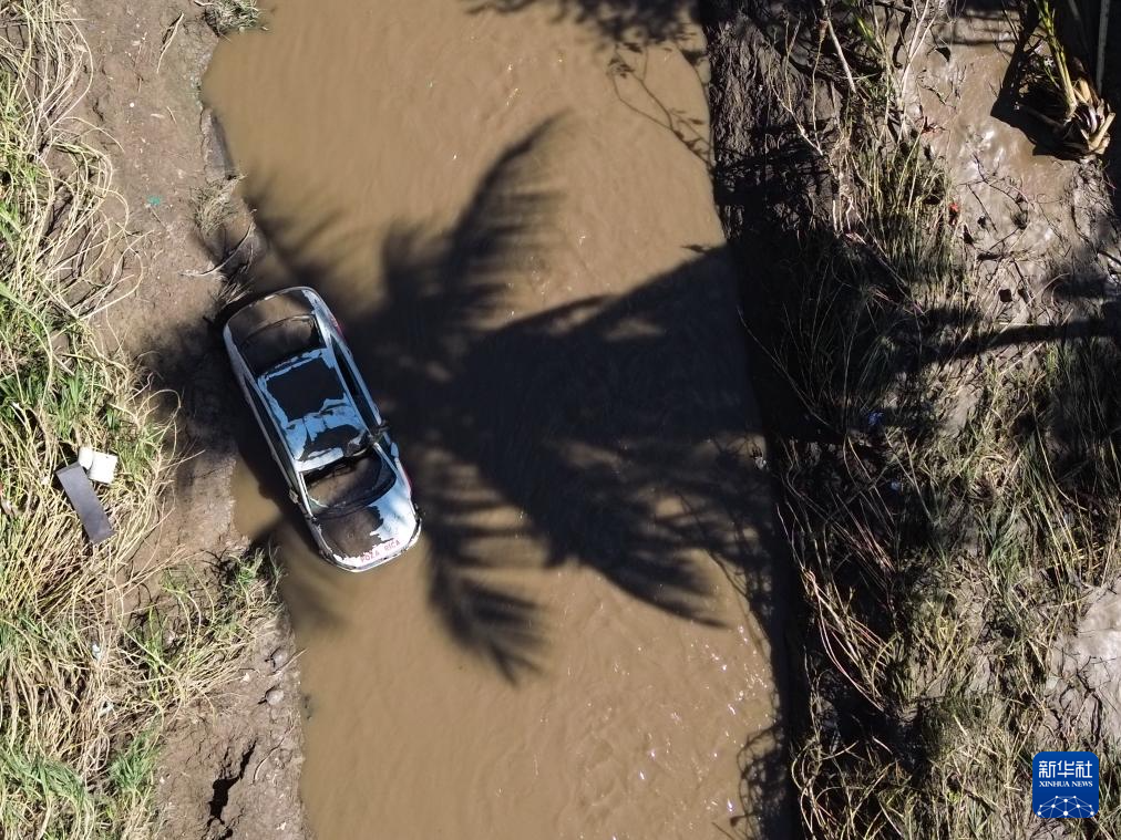 10月12日,在墨西哥韦拉克鲁斯州波萨里卡,一辆汽车陷在强降雨导致的积水中(无人机照片)。新华社发(弗朗西斯科·卡涅多摄)