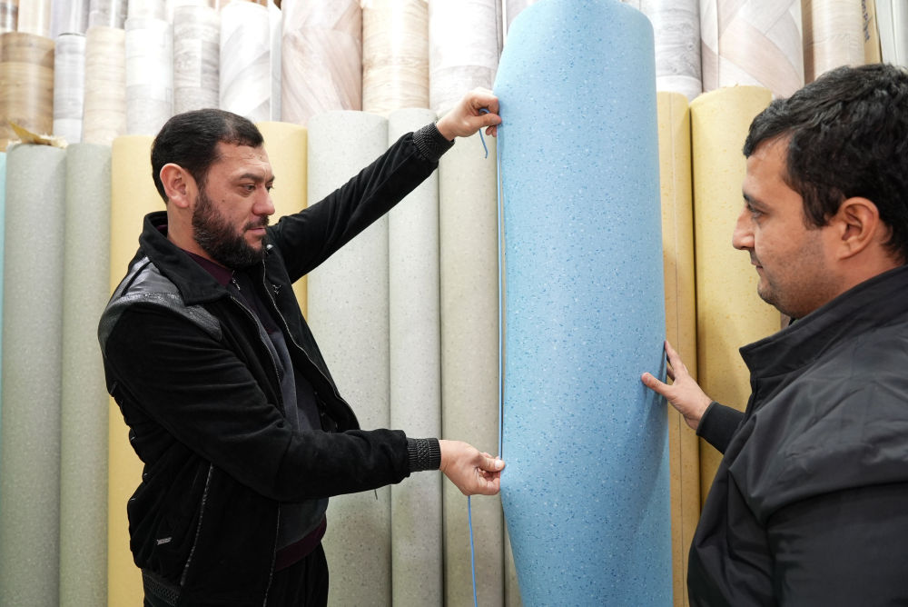 ↑12月12日,在乌兹别克斯坦首都塔什干,当地商家塔什普拉托夫(左)匹配与卷材地板同色的焊线。