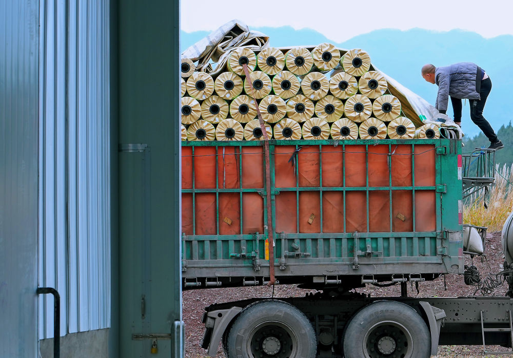 ↑12月12日,在四川省广元市,一辆载有卷材地板的货车驶出制造车间(无人机照片)。
