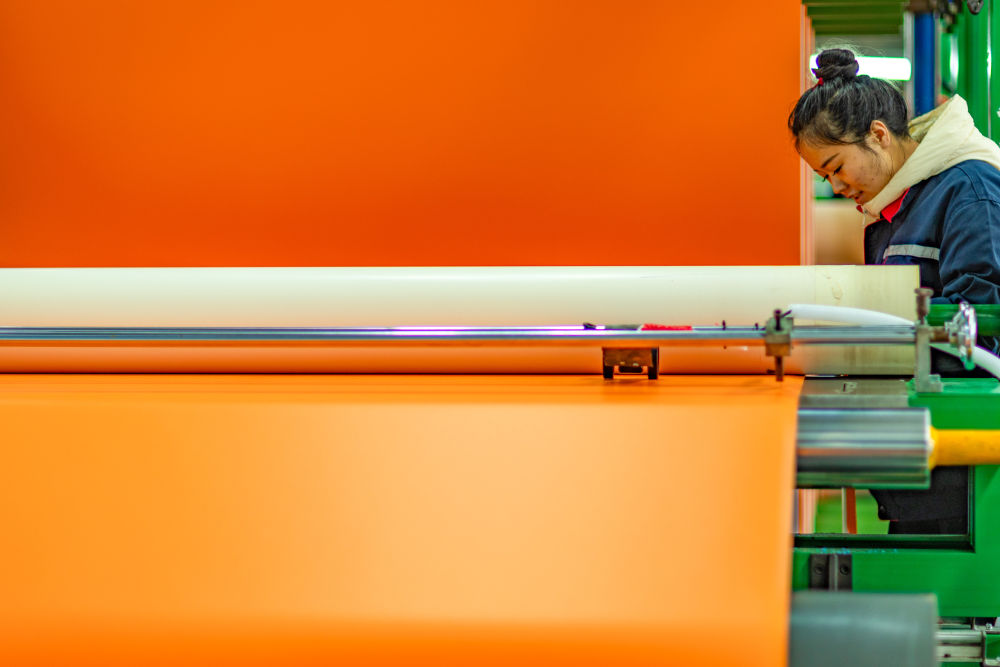 ↑12月12日,工人在四川省广元市一家卷材地板制造车间整理离型纸。