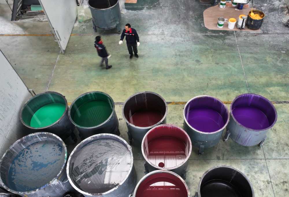 ↑这是12月12日在四川省广元市拍摄的一家卷材地板制造车间的颜料区(无人机照片)。