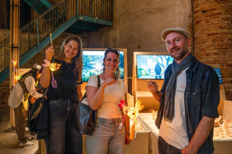 在意大利威尼斯举办的第19届威尼斯国际建筑双年展主题馆“塱头实验”展区,参观者展示现场领取的岭南鱼灯纪念品(2025年5月10日摄)。