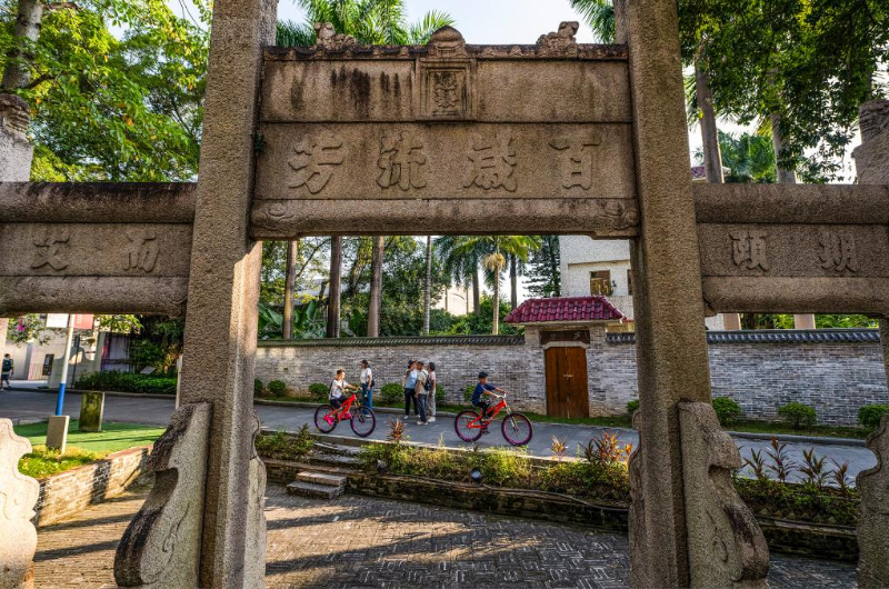 9月13日,孩子们骑车经过塱头村的升平人瑞牌坊。远处白色建筑是春阳台艺文中心。