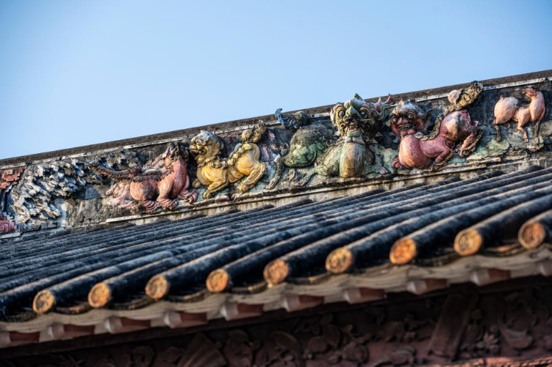 这是9月13日在塱头村积墨楼拍摄的灰塑装饰。