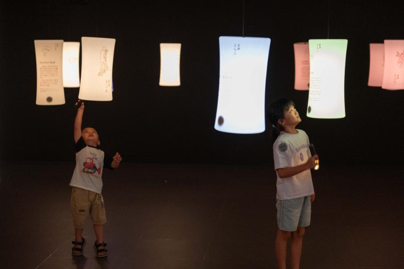 9月13日,孩子们在塱头村春阳台艺文中心的展览中体验一个空间互动装置。