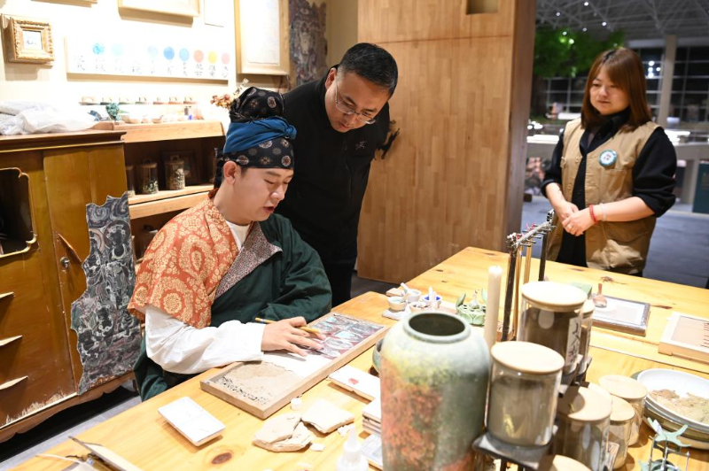 10月11日,游客在敦煌书局体验泥塑制作。