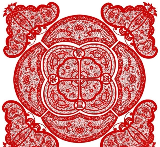 潮阳剪纸造型灵活多变,构图以对称为主,结构严谨,饱满而不杂乱。其中最令人称奇的是"花中套花"的布局手法——在主体图案中嵌入其他纹样,疏密有致,剔透玲珑,表现力十分丰富。