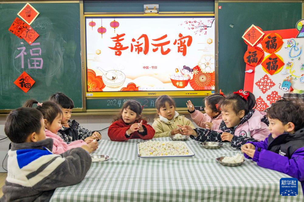 2月22日,江苏省泰州市九龙镇中心幼儿园的小朋友在制作汤圆。