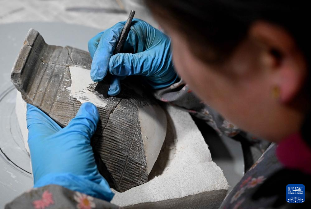 在中国社会科学院考古研究所安阳工作站,工作人员在对殷墟洹北商城出土的陶片进行整理修复(2024年2月23日摄)。新华社记者 李安 摄