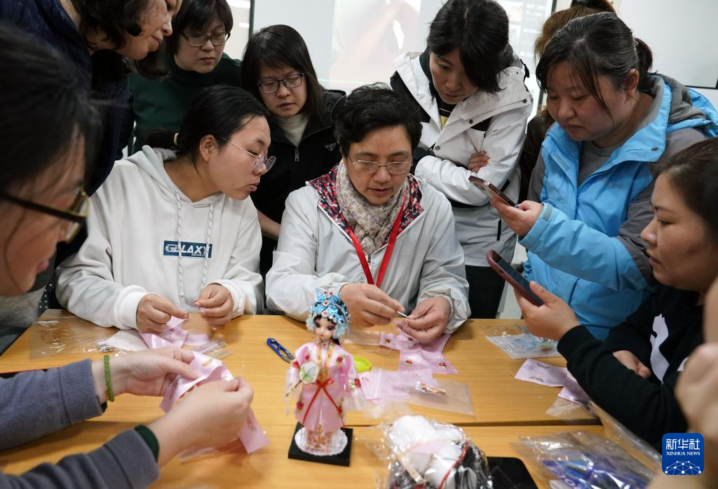 4月8日晚,在上海市群众艺术馆,“Q版娃娃制作”课程的夜校学员们在看老师讲解示范。