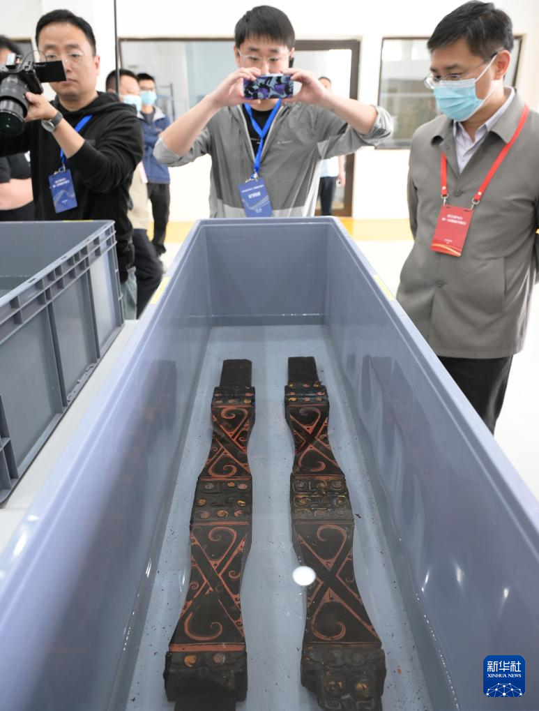 这是4月16日在武王墩墓考古实验室内拍摄的出土浮雕彩绘漆木构件。
