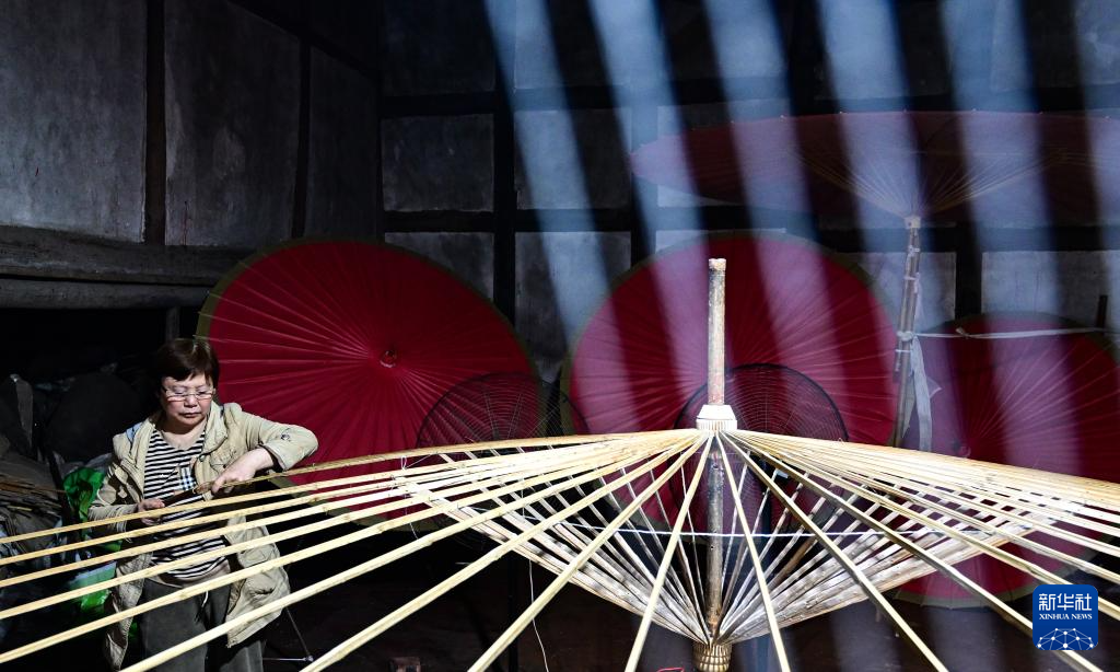 4月23日,在四川省泸州市江阳区分水岭镇,一家制伞作坊的工人在制作油纸伞。