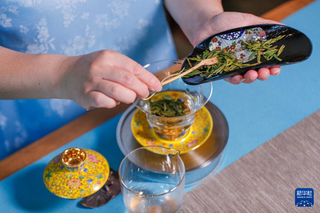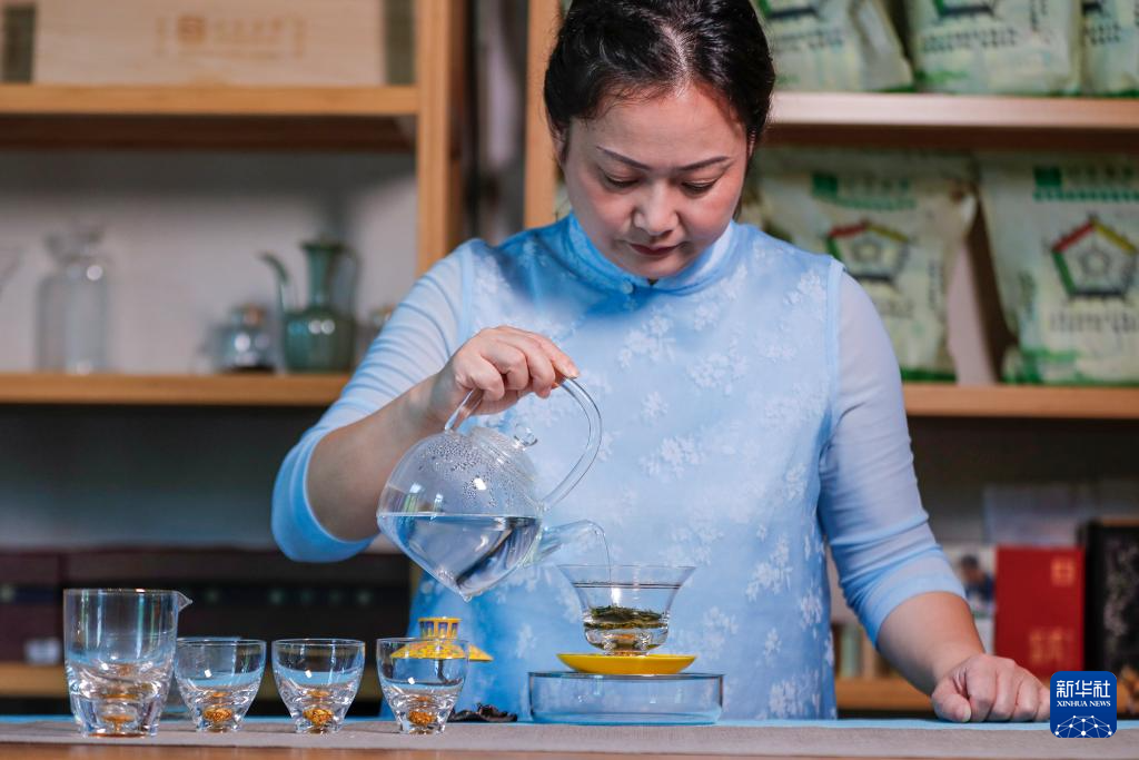 5月23日,在黄山市屯溪区一处茶空间,顾客品尝新式茶饮。