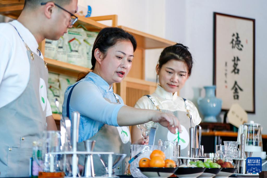 5月23日,在黄山市屯溪区德茗舍茶艺职业培训学校,顾客体验新中式调饮。