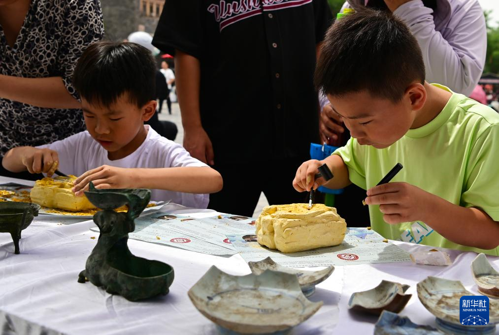 6月8日,在山东省聊城市中华水上古城景区,小游客通过开“考古盲盒”体验文物发掘过程。