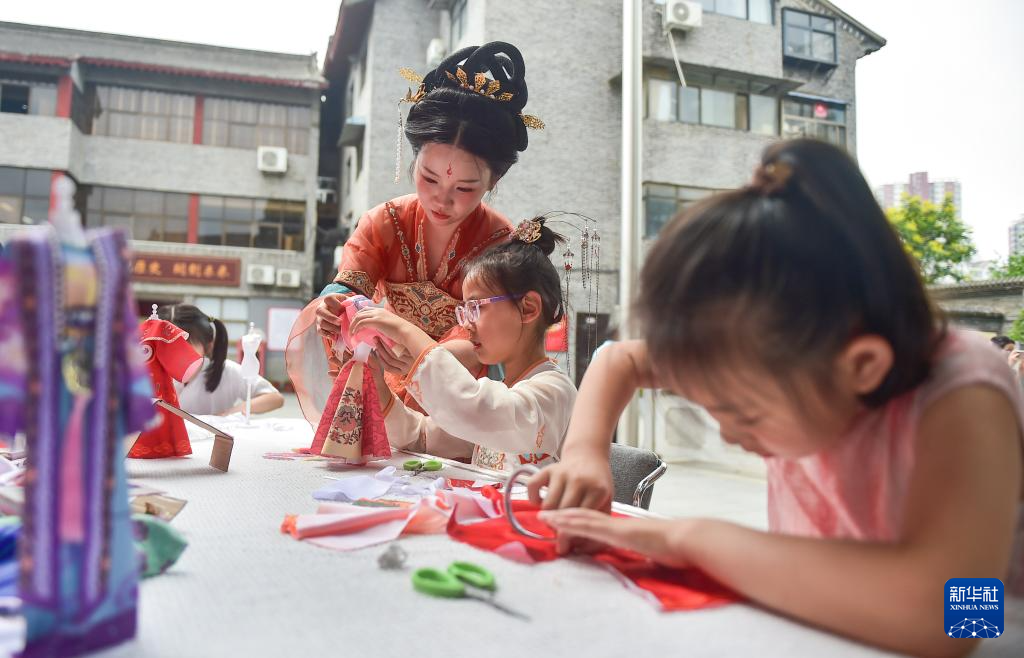 6月8日,小朋友在河南省洛阳市老城区体验制作古代服饰。