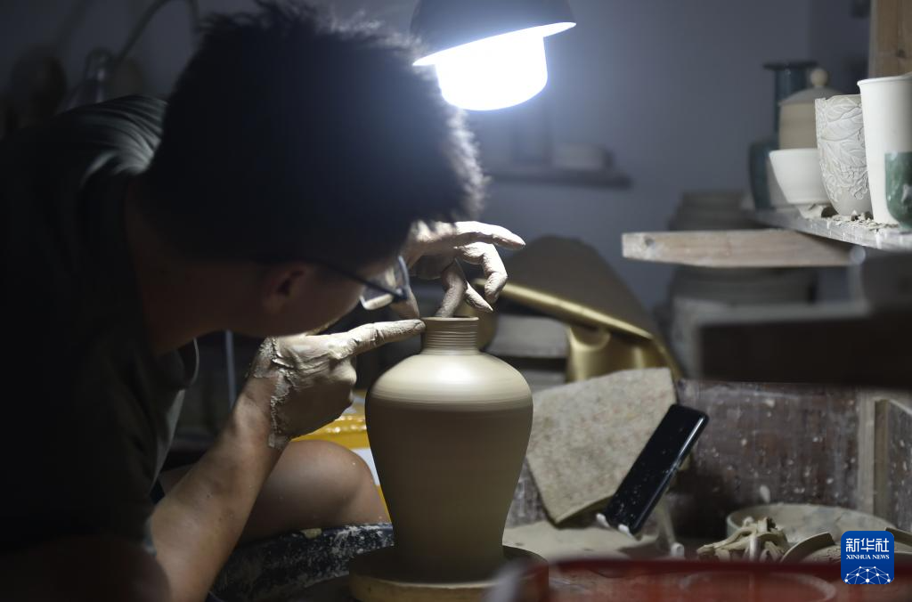 8月6日,在浙江省龙泉市一家青瓷工作室,青瓷艺人陈果检查素坯质量。