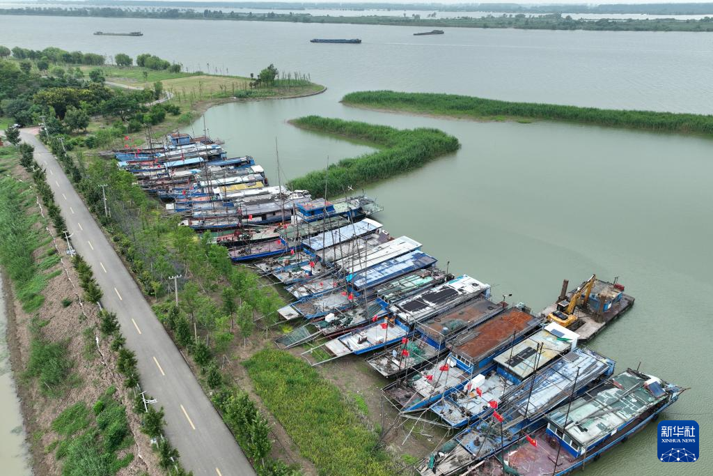 8月28日拍摄的停靠在江苏省淮安市洪泽区老子山镇龟山村的退捕渔船(无人机照片)。2020年当地推动退捕禁捕,渔船进港封存。