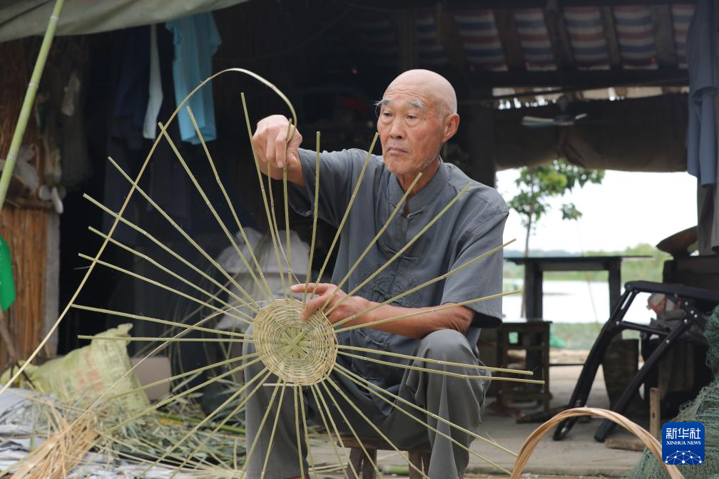 8月27日,江苏省淮安市洪泽区老子山镇龟山村村民在编织竹篮。