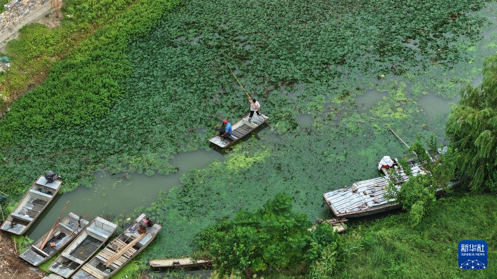 8月27日,村民在江苏省淮安市洪泽区老子山镇龟山村采摘菱角(无人机照片)。