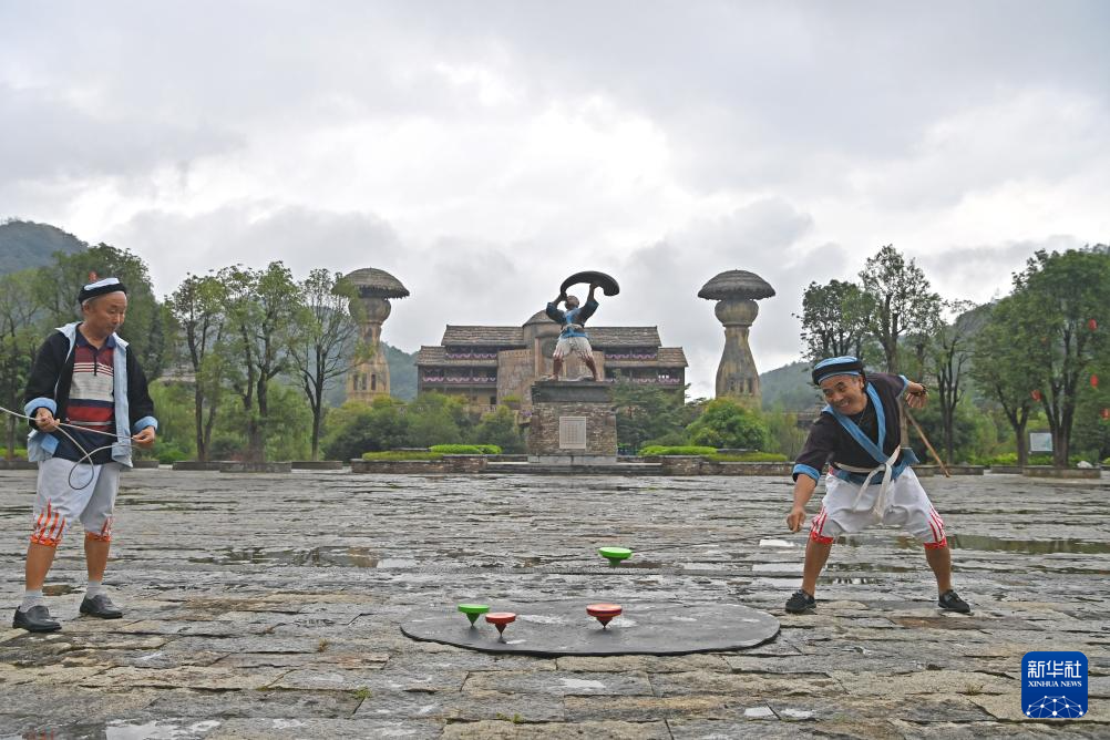 何光斌在南丹县里湖瑶族乡朵努社区展示在脚上放陀螺(8月30日摄)。