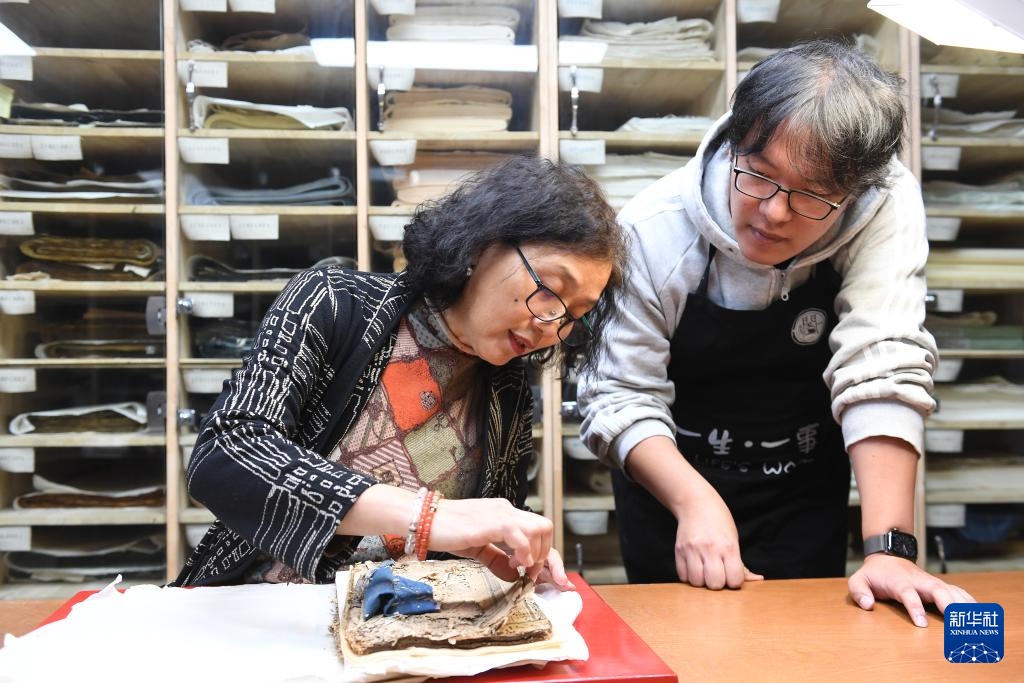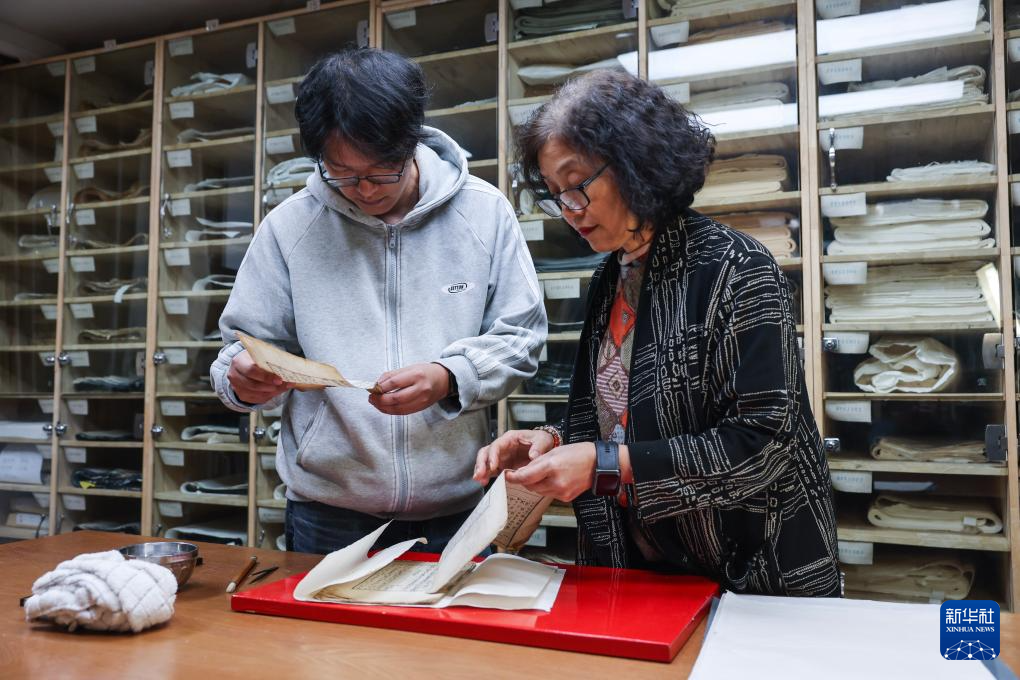 11月18日,在天一阁文物修复中心,谢龙龙(左)在王金玉指导下进行古籍修复的准备工作。
