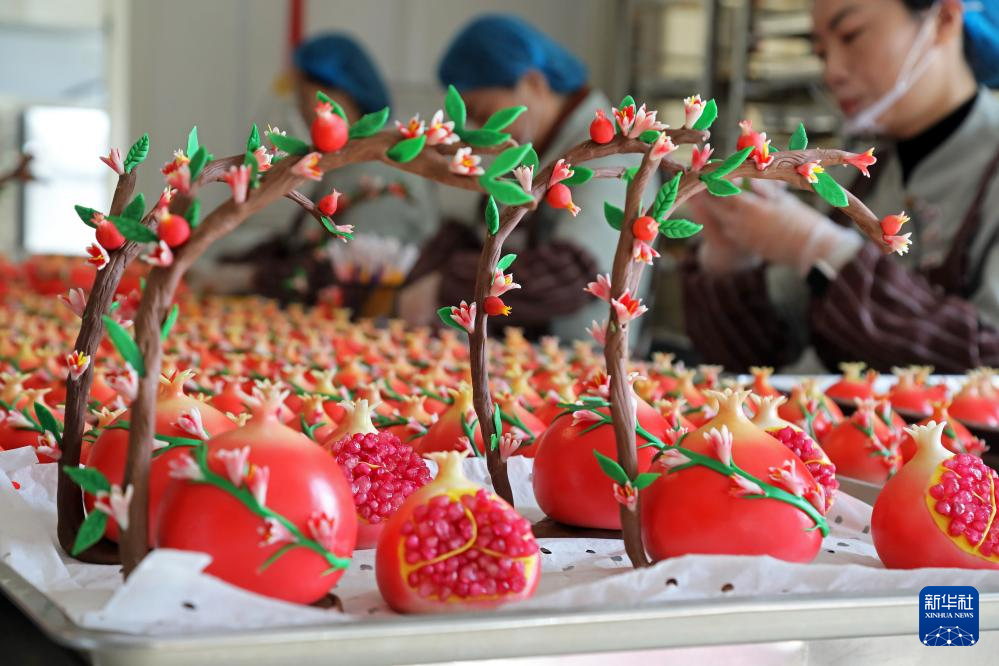 12月29日,民间艺人在山东省枣庄市“红石榴”喜馍制作工坊捏制“红石榴”喜馍上的装饰物。