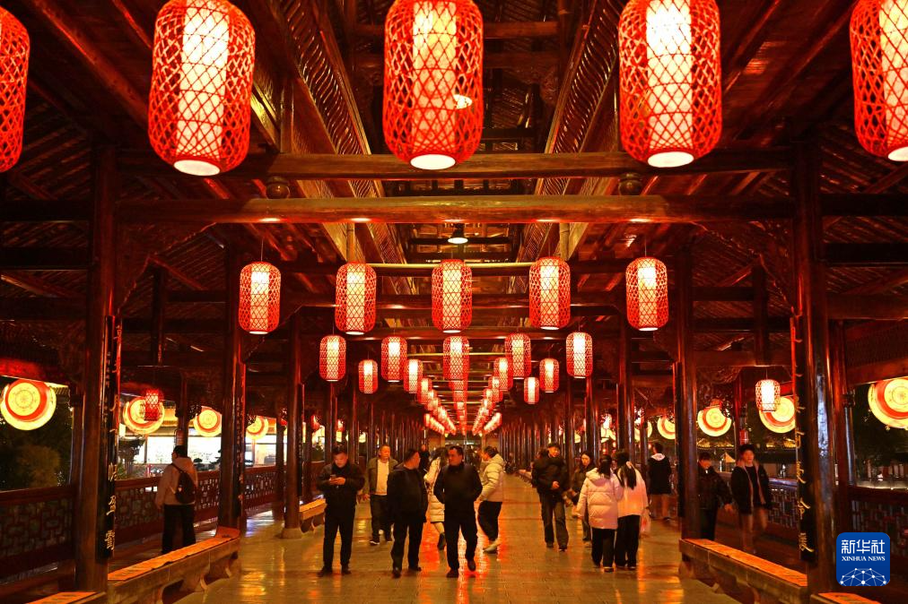 12月28日晚,湖北省宣恩县城的风雨桥上灯笼高挂,人们观光游览。