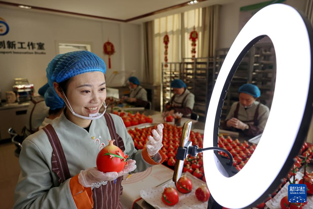 12月29日,在山东省枣庄市“红石榴”喜馍制作工坊,民间艺人通过网络直播介绍“红石榴”喜馍制作方法。