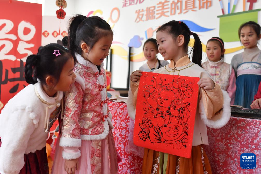 12月30日,在山东青岛吉林路小学开展的“民俗文化迎新年”主题活动上,孩子们在观看学做的非遗木版年画。