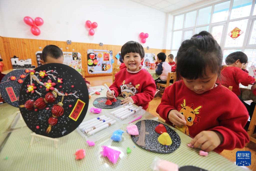 12月30日,在甘肃省平凉市静宁县第一幼儿园,老师在指导孩子们拓印年画和福字。
