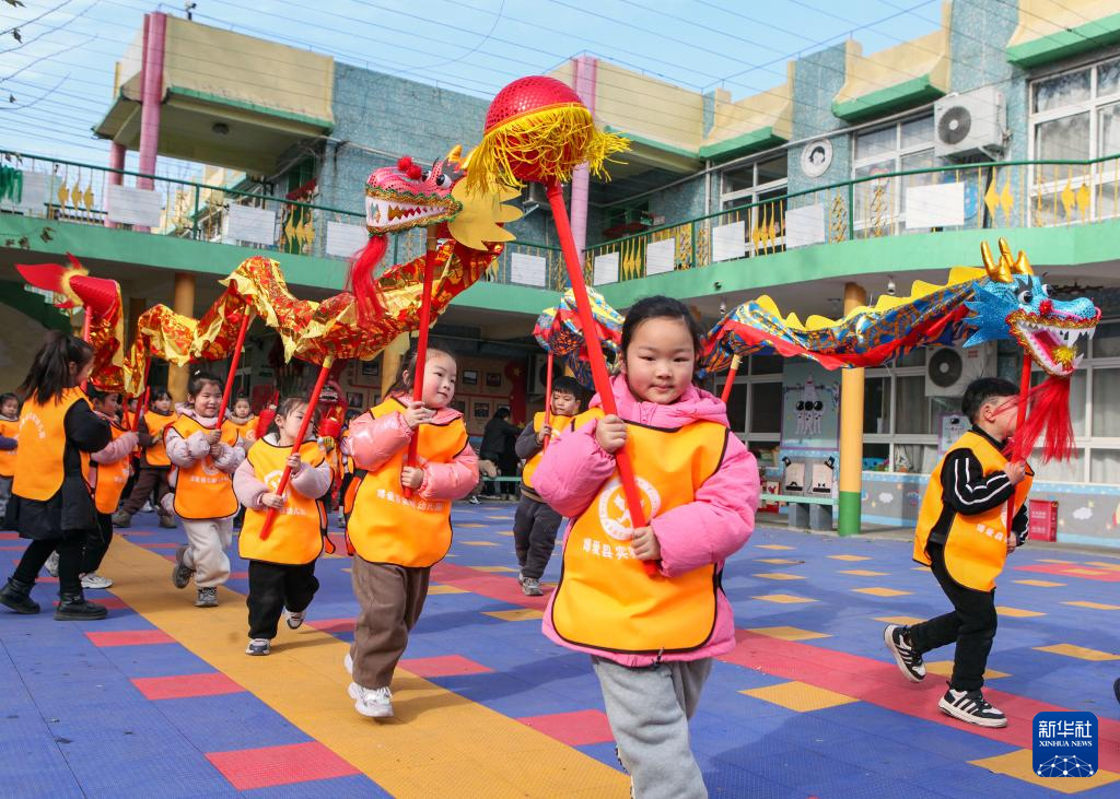 12月30日,河南省焦作市博爱县实验幼儿园的孩子们表演舞龙迎新年。