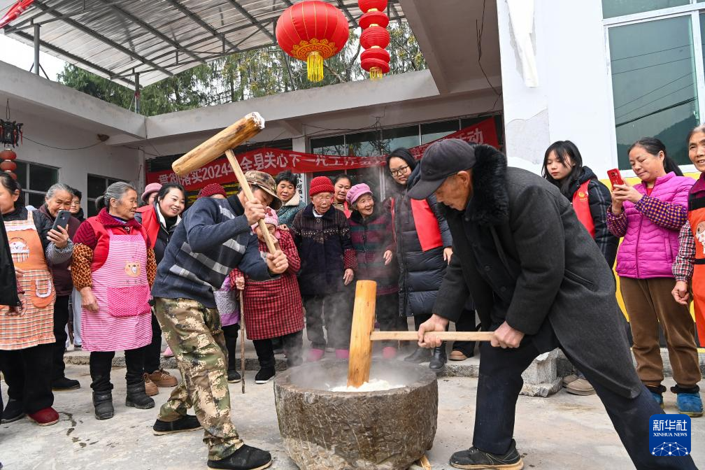12月30日,在重庆市酉阳土家族苗族自治县小河镇小岗村老年食堂,青年志愿者和老人们一起打糍粑,喜迎新年。