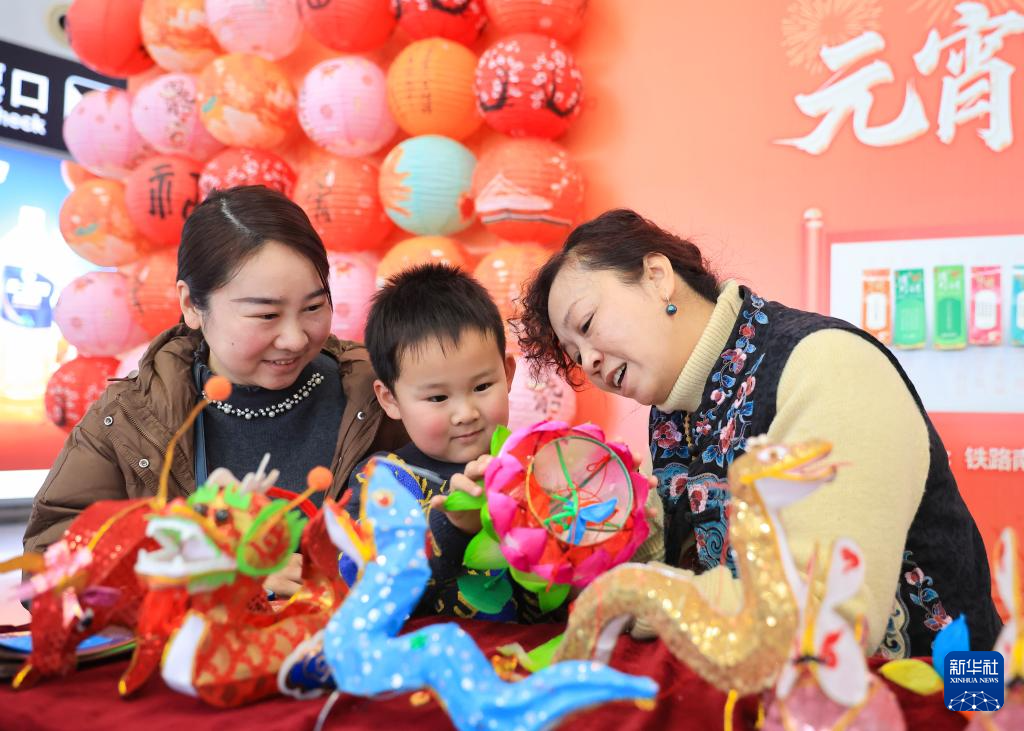 2月11日,旅客在南京南站举办的迎接元宵节活动上体验制作花灯。
