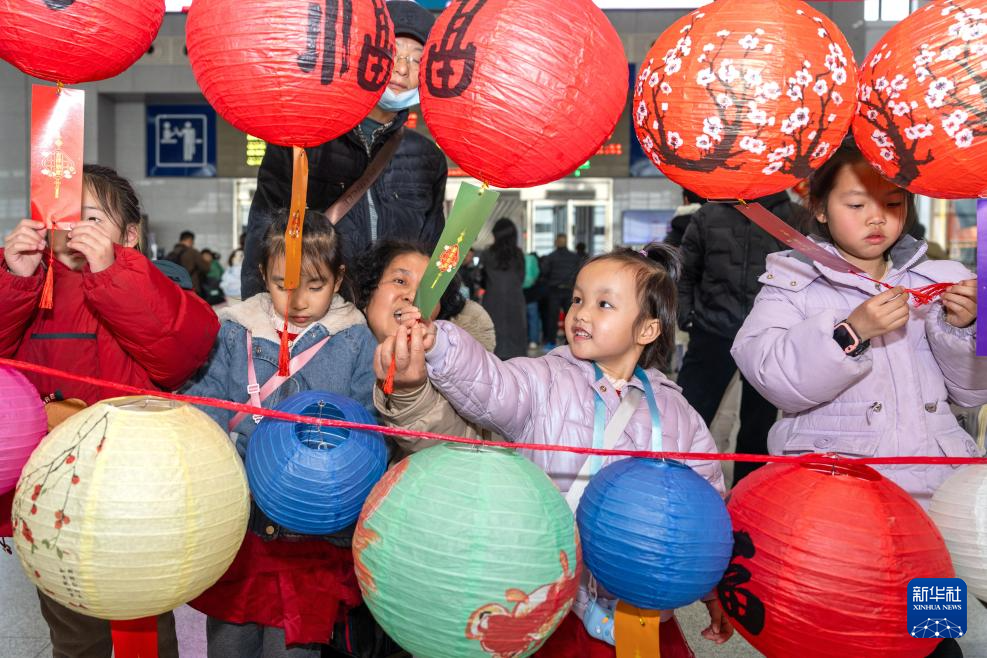 2月11日,孩子们在江西鹰潭北站猜灯谜。