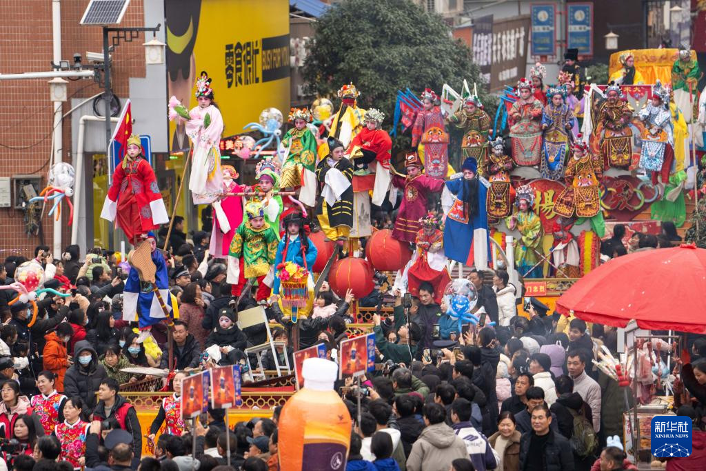 2月11日,在湖南省汨罗市长乐镇,人们参加抬阁故事会。“长乐抬阁故事会”是长乐镇当地一项传承千年的元宵节民俗活动,2011年入选国家级非物质文化遗产扩展项目名录。