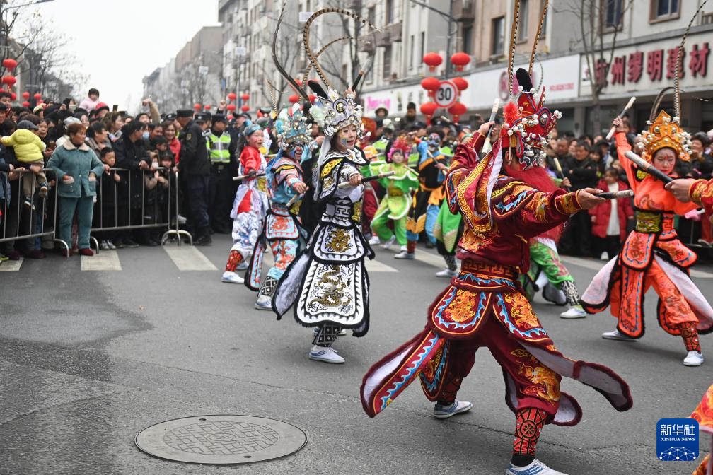 2月11日,演员在乌鲁木齐大巴扎步行街举办的社火巡游活动中表演。