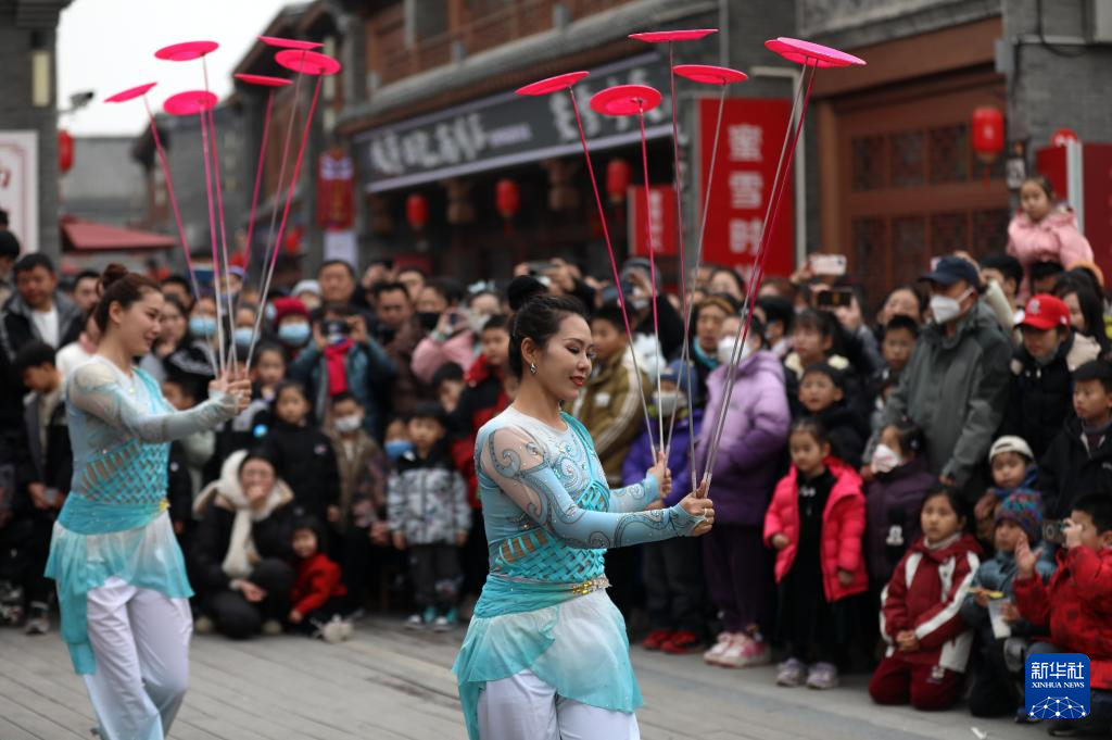 2月11日,在河北省沧州市运河区南川老街景区,民间艺人为游客表演杂技节目《转花碟》。