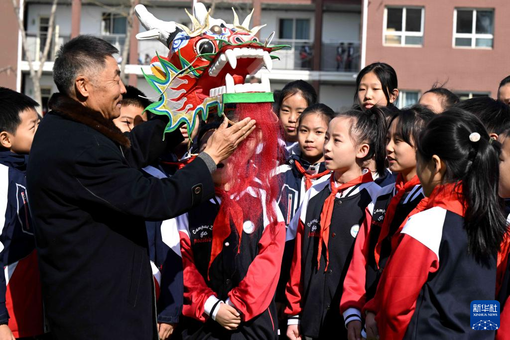 2月26日,石家庄市草场街小学学生在欣赏龙风筝。