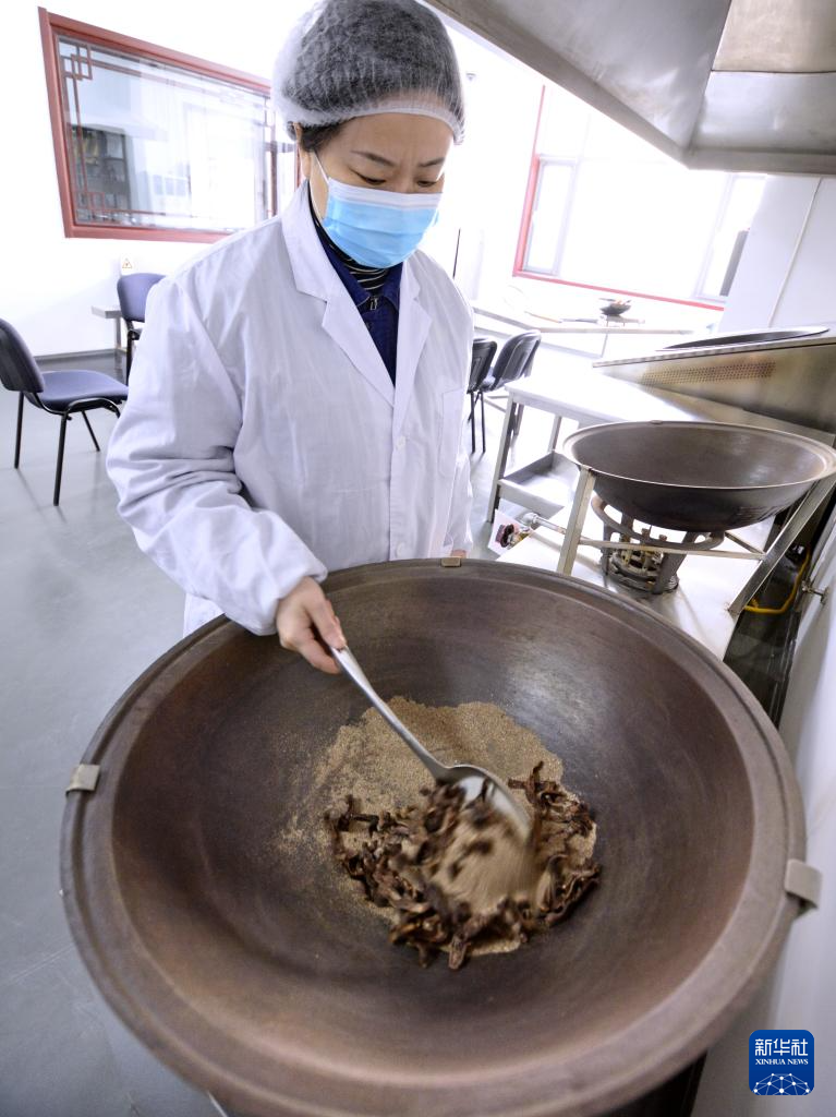 2月23日,同仁堂国家级非物质文化遗产生产性保护示范基地项目成员、中药炮制技艺首席技师吕建媛在展示传统中药材炒制技艺。
