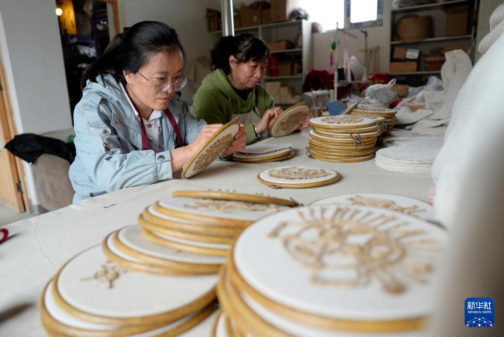 3月26日,在宁夏非遗麻编传承基地,当地村民在制作麻编产品。