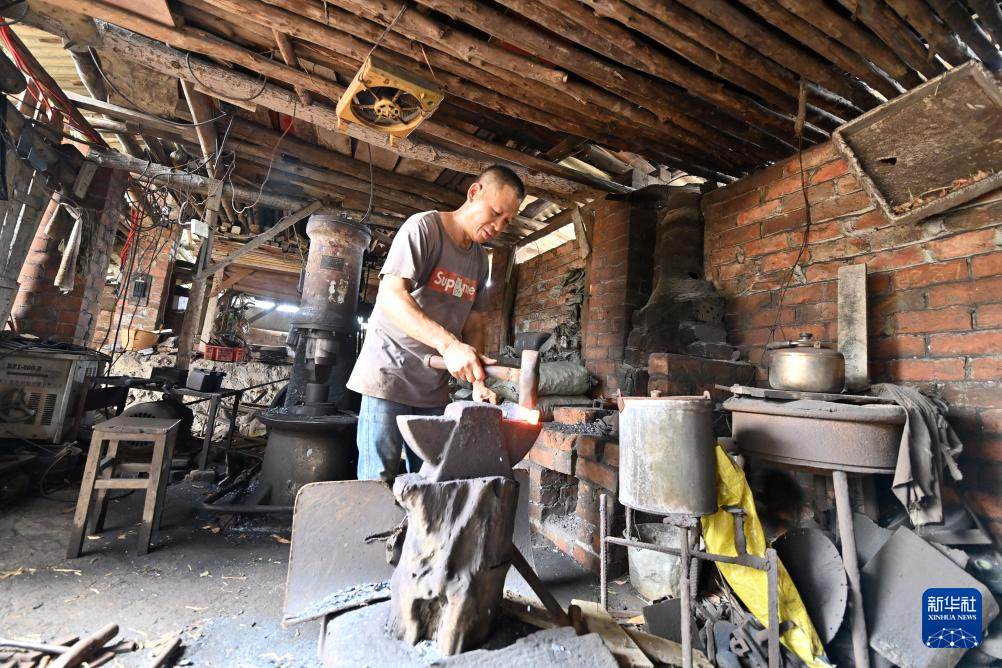 7月16日,广西隆安县雁江镇红良村,村民凌维军在自己的作坊里打制铁具。